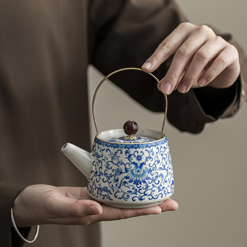 米黄汝窯ティーポット家庭用ティーポットカンフー茶器レトロ単壺濾過中国式提梁壺高級青花