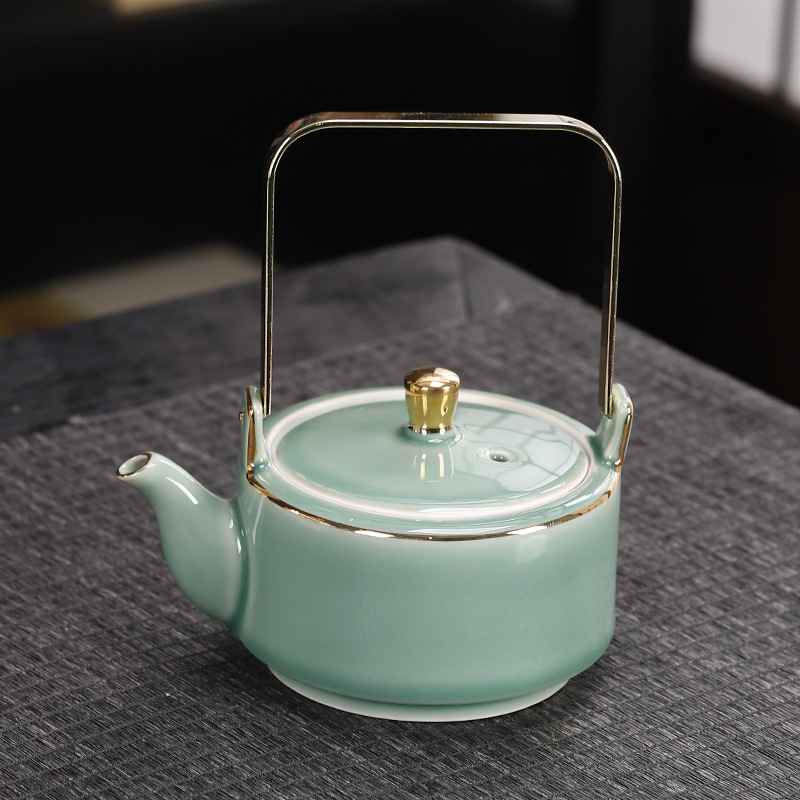 米黄汝窯開片急須家庭用泡急須カンフー茶器レトロ単壺濾過中国式提梁壺高級