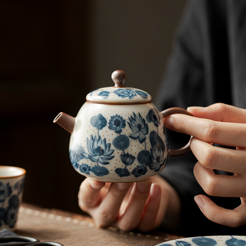 汝窯歩歩生蓮陶磁器ティーポット工夫茶器家庭用茶器開片可養ティーポットギフトボックス