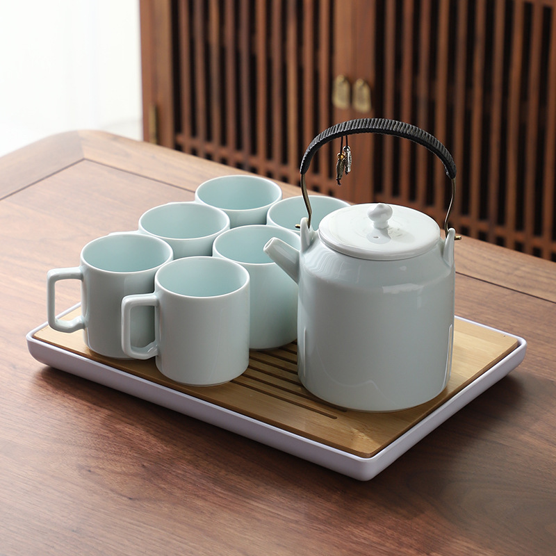 越境陶磁器クリーム風雲峰提梁壺茶器セット純色日本式シンプル大容量ティーポット