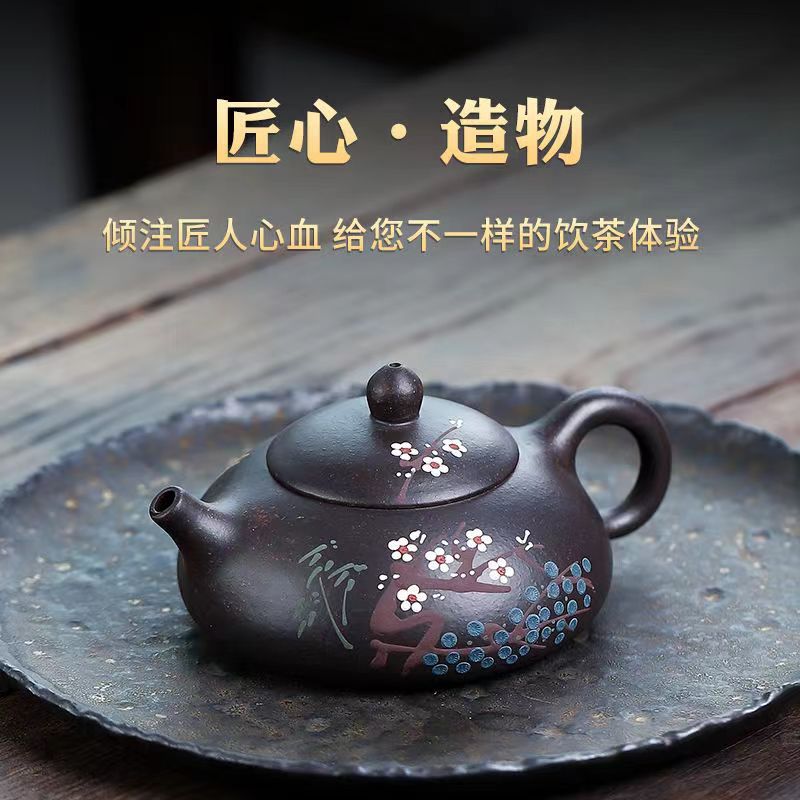 正統宜興紫砂壺原鉱黒金砂泥絵歳寒三友東坂石瓢箪壺家庭用カンフーティーポット