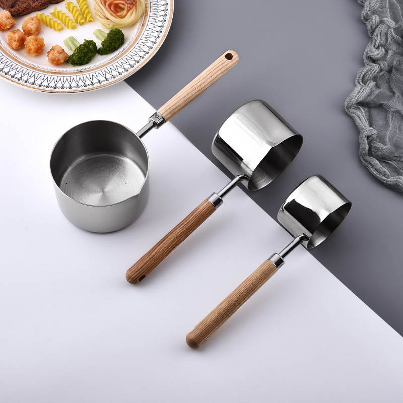 ステンレス製計量スプーン、耐熱木製ハンドル付きベーキングカップ、油こし鍋、温乳カップ、電磁調理器対応、1個から大量注文可能