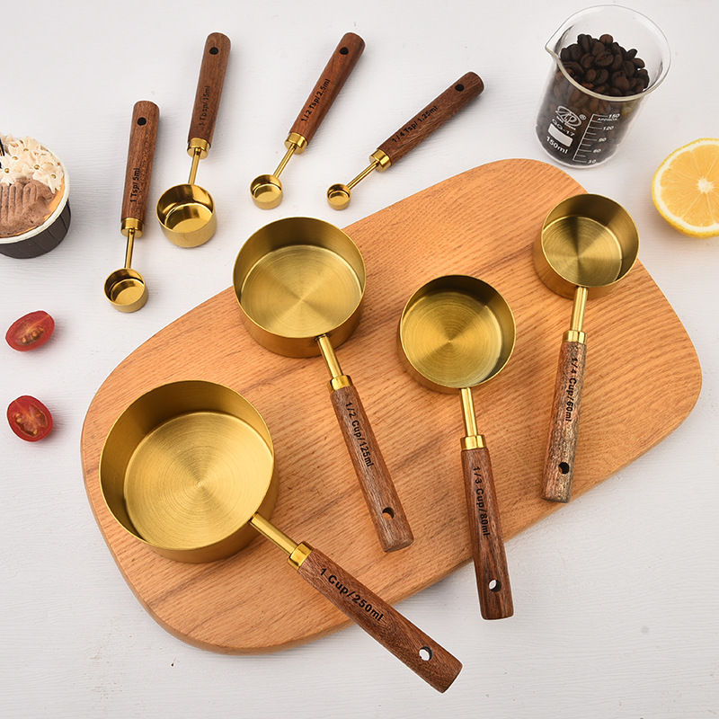 ステンレス製計量カップと計量スプーン 8点セット アカシア材計量カップと計量スプーン 計量ツール 粉ミルク計量ベーキングツール 4点セット