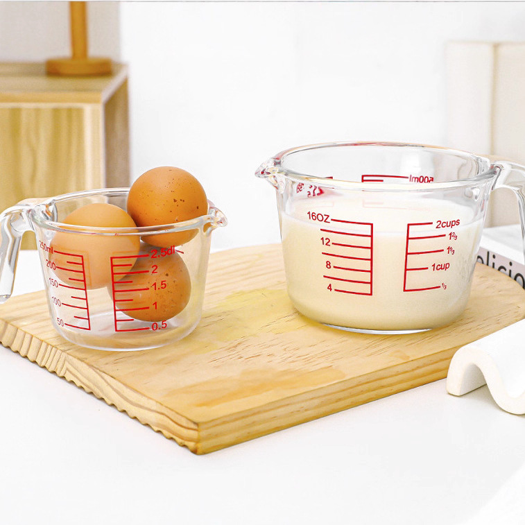 高温耐性ガラス計量カップ、目盛り付きビーカー、ハンドル付き卵カップ、電子レンジ加熱可能な生乳専用カップ