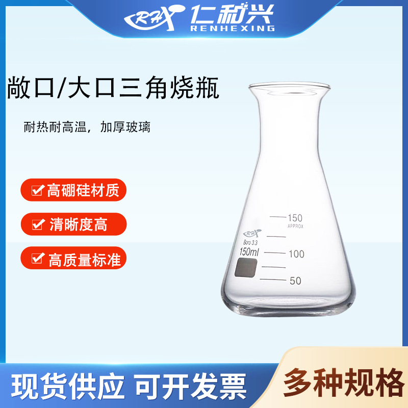 仁和興ガラス三角フラスコ、大口三角フラスコ、実験室加熱用、高ホウケイ酸ガラス、耐高温、耐腐食、送料無料
