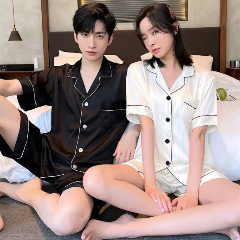 カップルのパジャマの女性の男性の夏の氷の滑らかな大きいサイズの半袖の家庭服のゆったりしたシルクの薄いスーツ