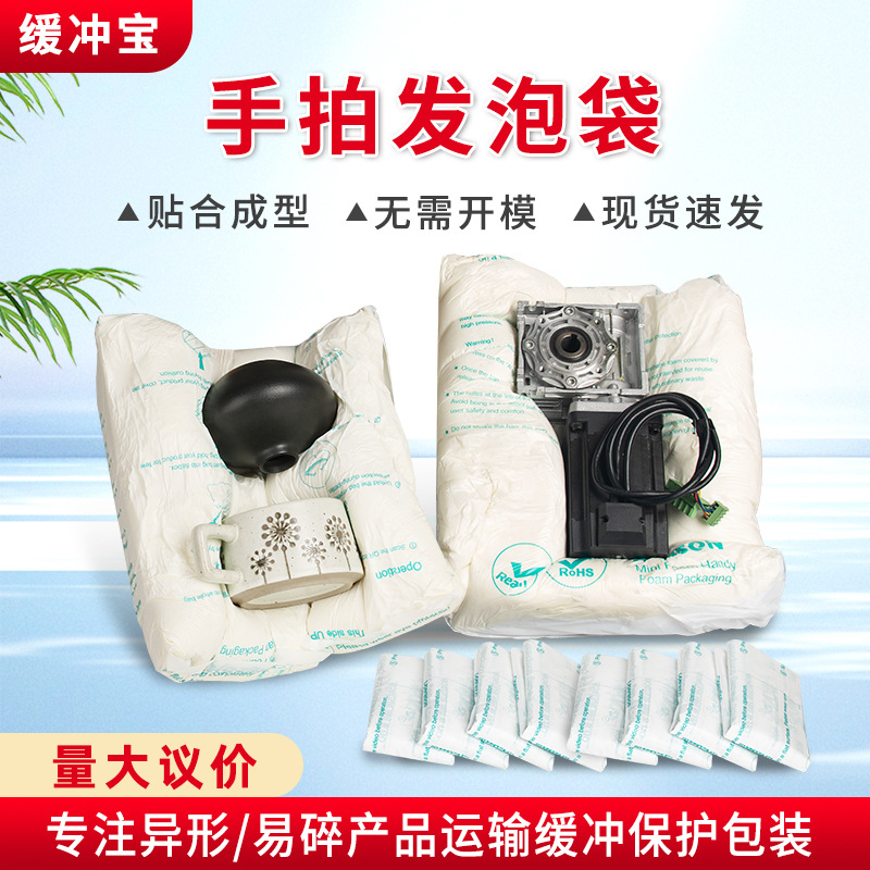 ポリウレタン製圧縮式ハンドパット発泡袋、特殊形状の壊れやすい製品用緩衝・防振包装、インスタントABハンドパット発泡袋