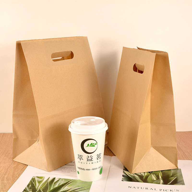 現物飲食焙煎パン窯鶏の出前包装袋の方底クラフト紙袋の穴を開けて手提げ食品包装袋を作る