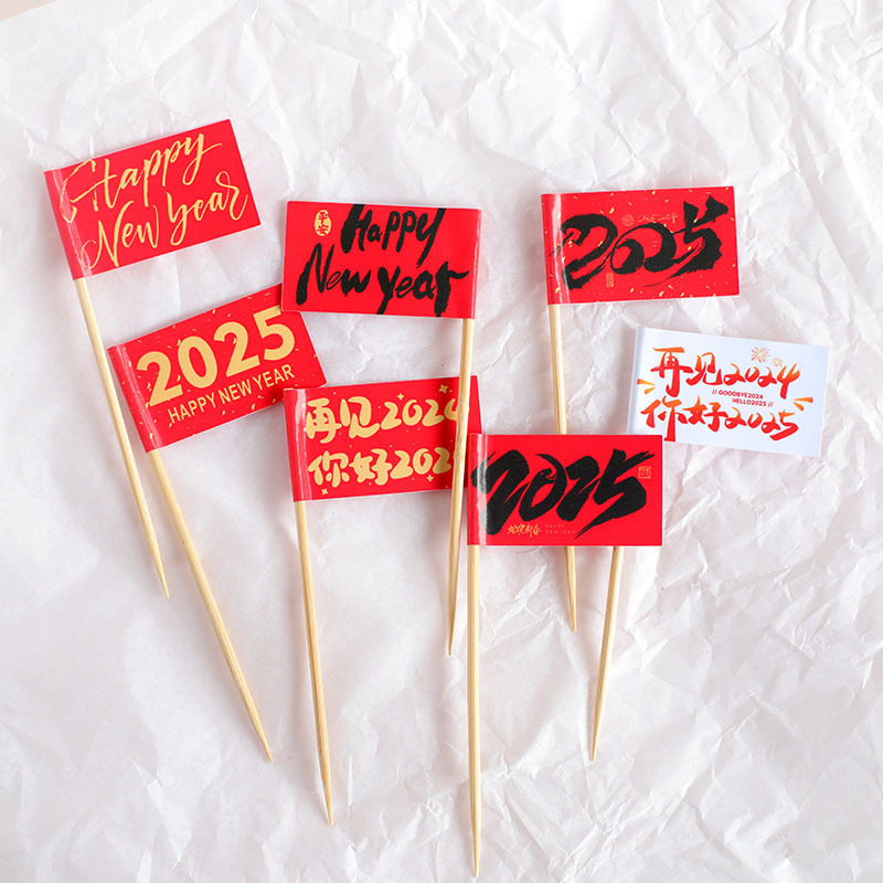 美しいピンクの小さな花のつまようじに旗を挿します。
