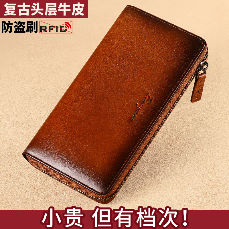 クロスボーダー爆発rfid盗難防止ブラシ財布縦型トップ層オイルワックス牛革多機能ダブルファスナー男性財布