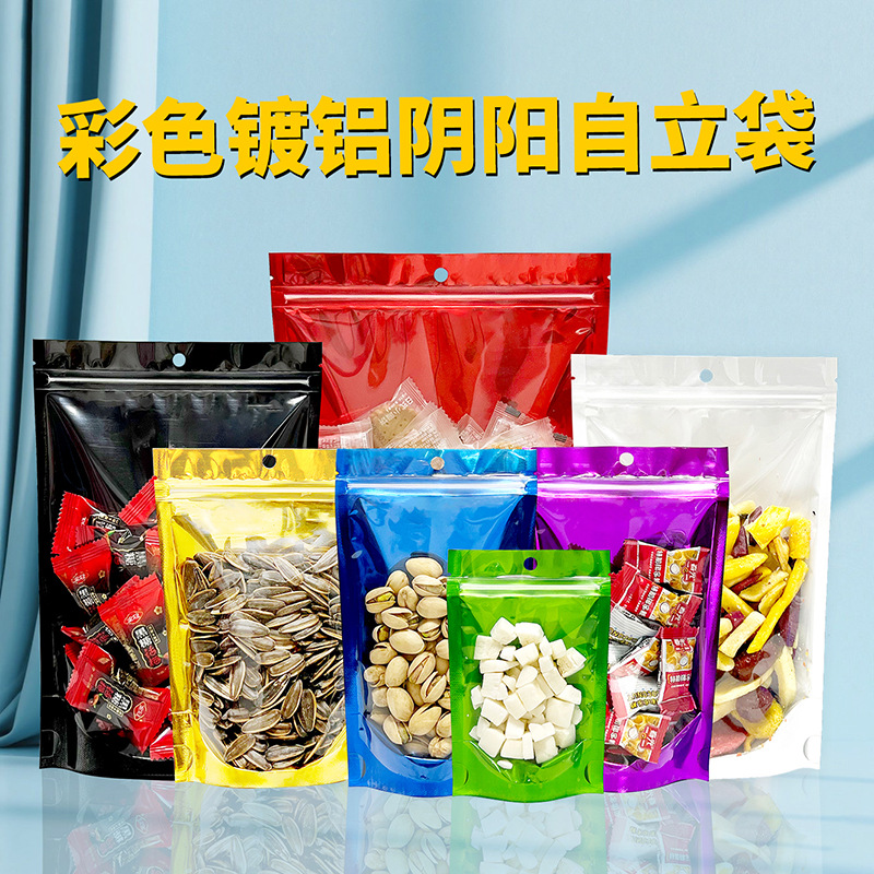 カラフルな陰陽ジップロックバッグアルミ箔密封バッグキャンディースナックスーパーマーケット吊り下げ可能な穴プラスチック包装袋