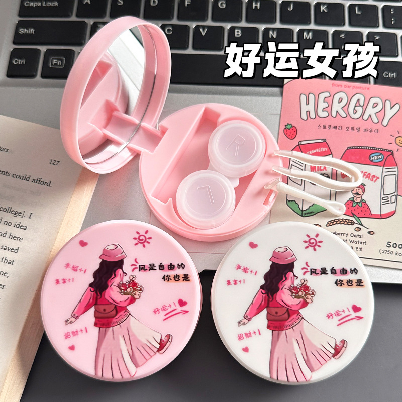 かわいい鏡付き少女の個性的なパートナー双聯美瞳ケースコンタクトレンズケース携帯小型ミニシンプル