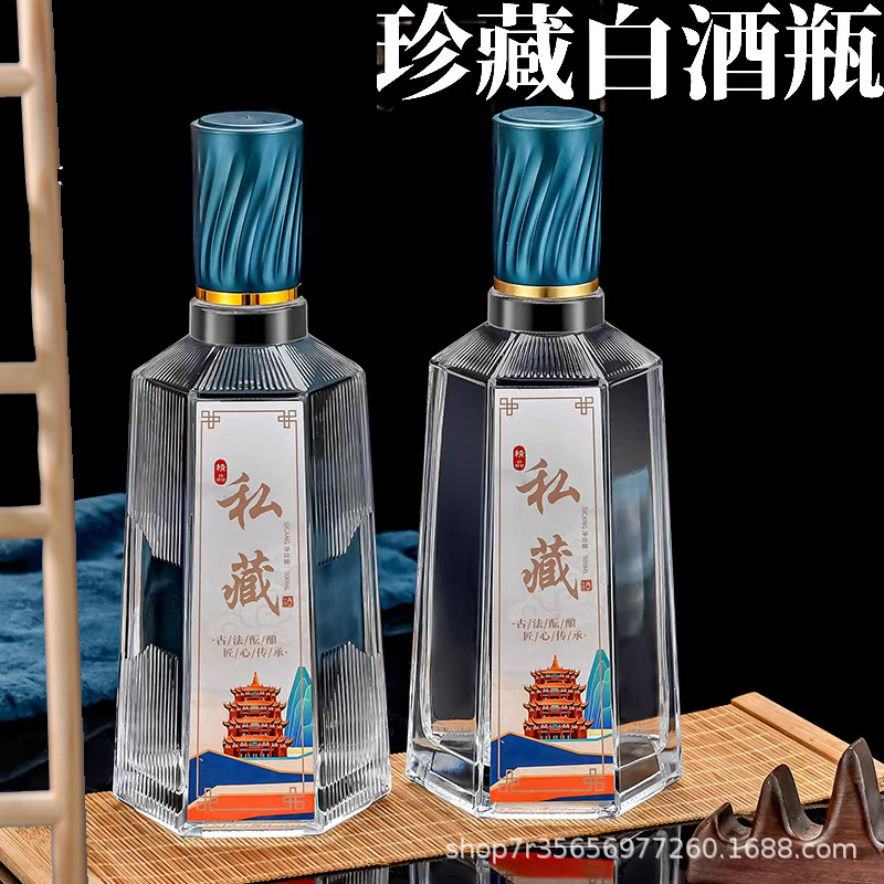 クリスタルホワイト素材500ml六角形縦型白酒ガラス瓶空瓶ギフトボックスセットカスタムウェディング透明ガラス