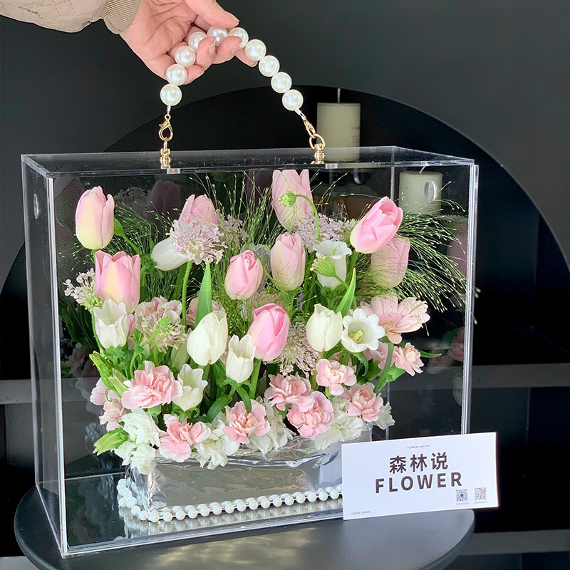 バレンタインデー用ハンドヘルドフラワーボックスギフトボックス透明アクリルフラワーバスケット生花インスタ風雰囲気のある花束ギフトフラワーアート
