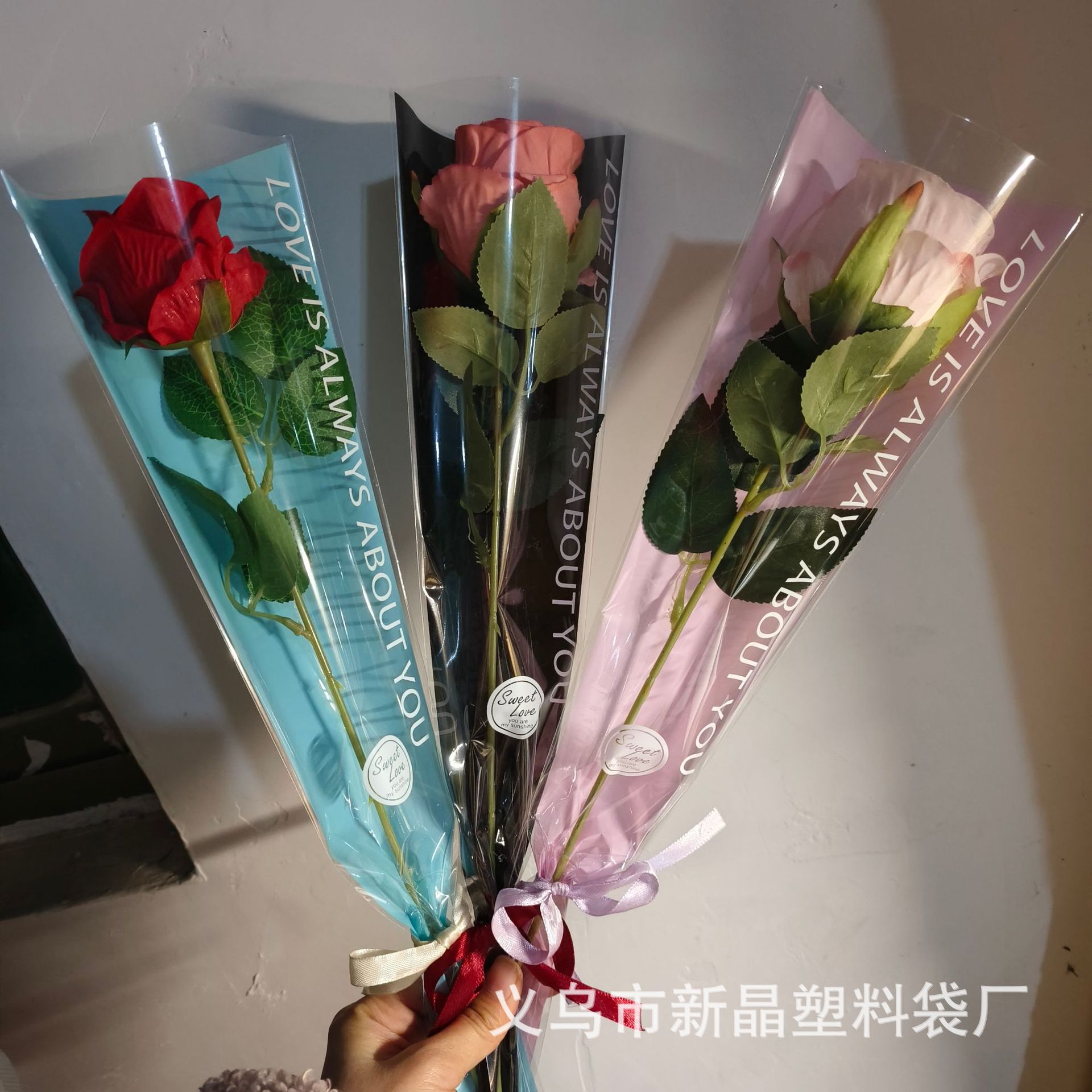 カラーの枠の多い袋の義烏工場はバラの花の袋の透明な袋の単枝の袋の生花の包装袋を卸売りします。