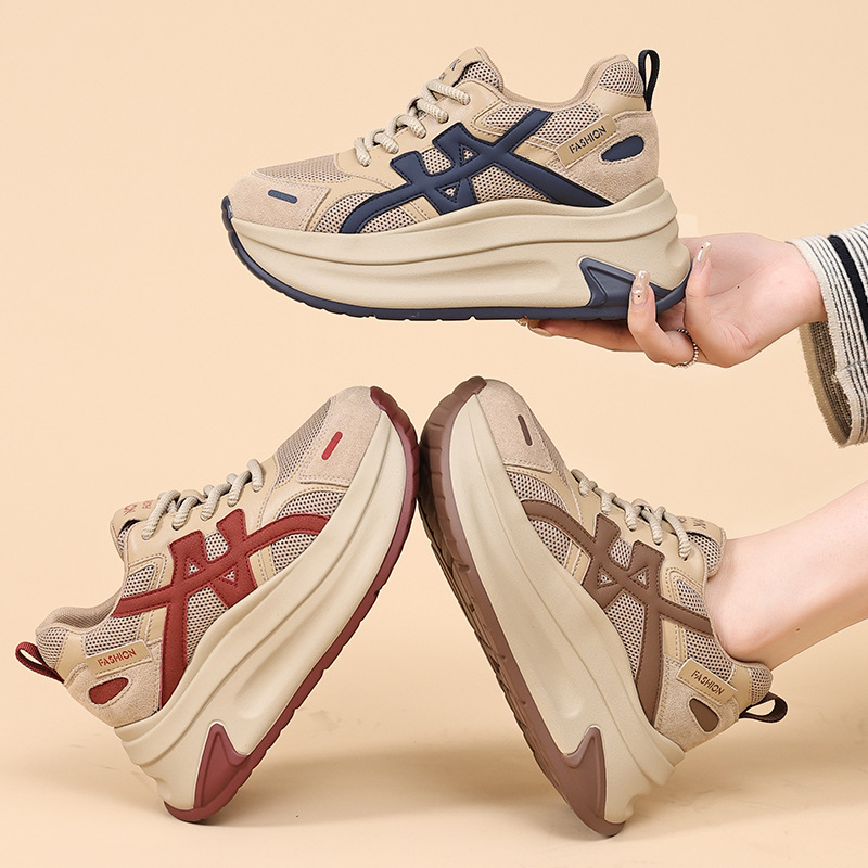 2025 秋と冬の新しいスタイルのインナー高さカジュアル厚底レトロカラーマッチングフォレストシューズメッシュシューズ通気性のあるお父さん靴女性の靴