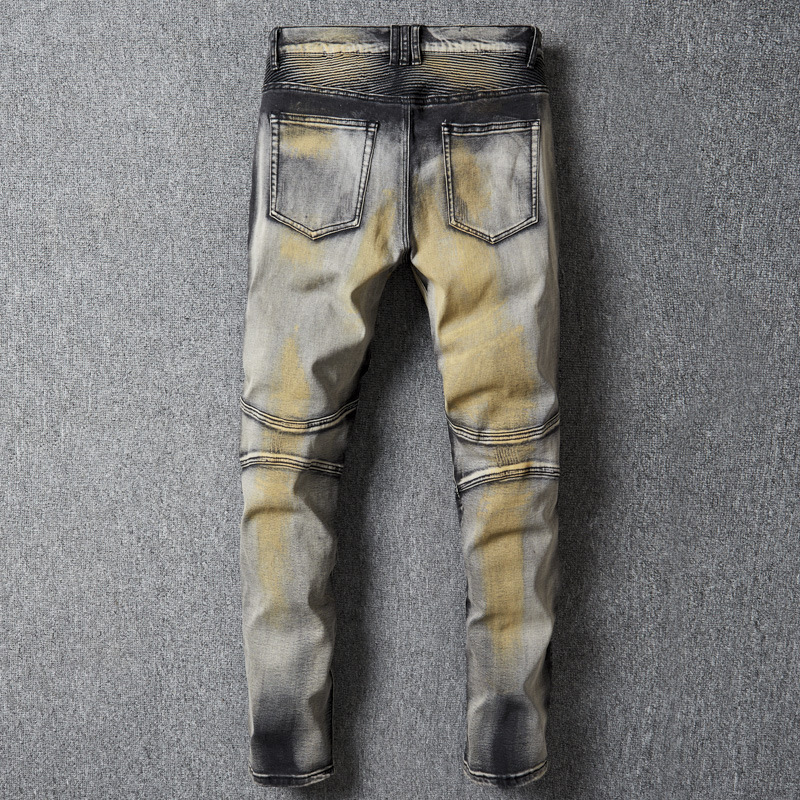 オーダーメード加工パッチングマシン車デニム長ズボンのファスナーのポケットのタイプは人工的にペンキを振ってブランドを貼ります。