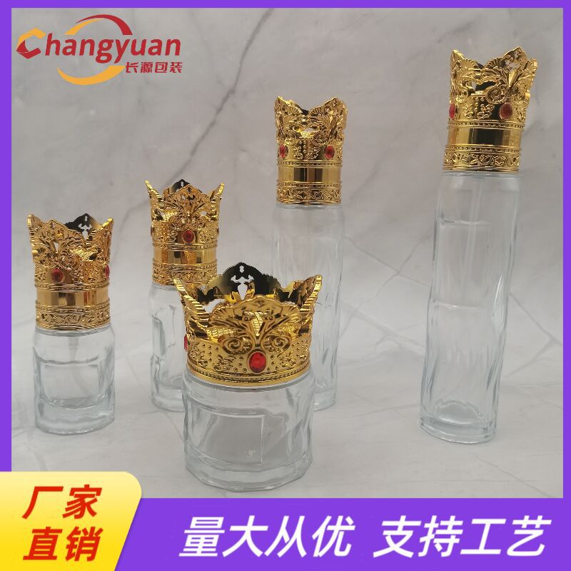 高級精油瓶の空き瓶のバヨネットキャップは蓋の金色のクラウン化粧品の包装瓶の卸売りを強めます。