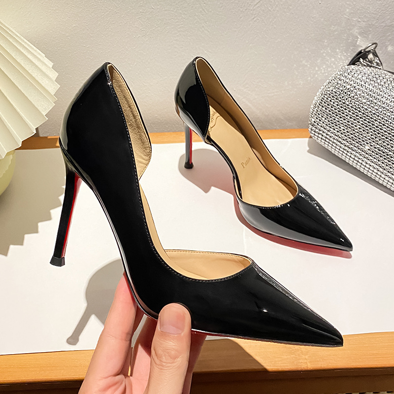2025 春と秋の新作ポインテッドトゥサイド中空赤底ヌードハイヒール女性のための美しいスティレットヒール気質黒パテントレザーの靴