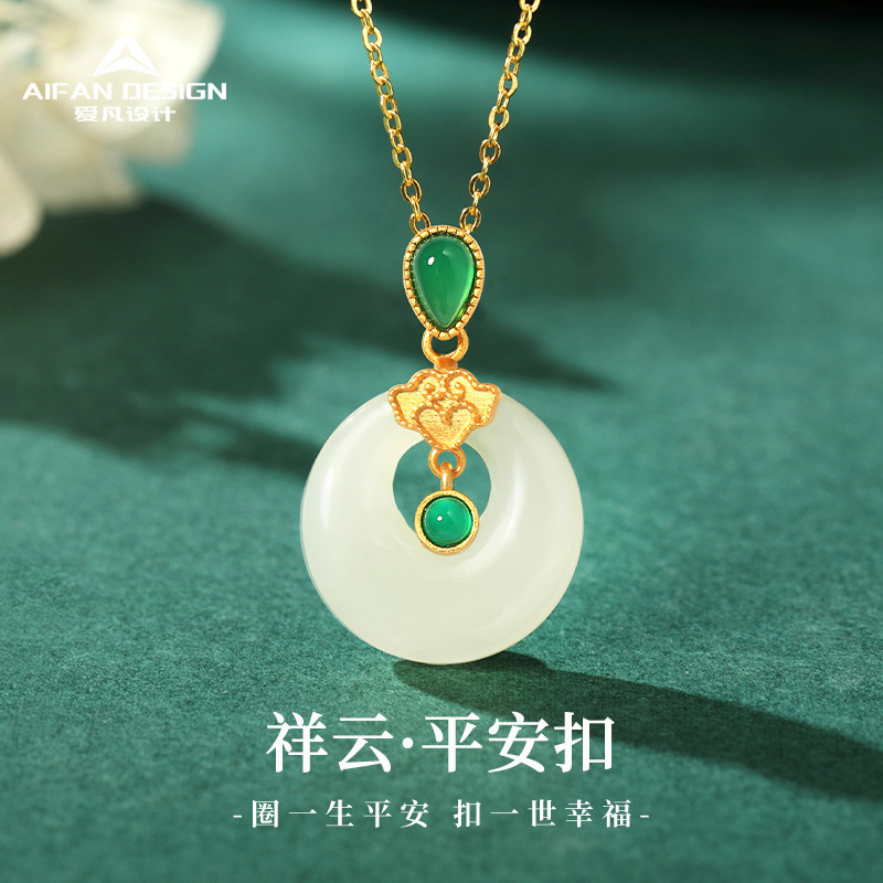 天然Hetian翡翠安全バックルネックレス女性のライト高級s925シルバー祥雲中国風ペンダントママギフト卸売
