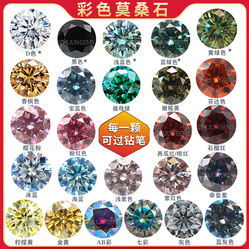 ラウンドシェイプの八心八矢カラーモアサナイト原石リング用石、レッド、ブルー、グリーン、イエロー、シャンパン、ファンタピンクのダイヤモンド付き石