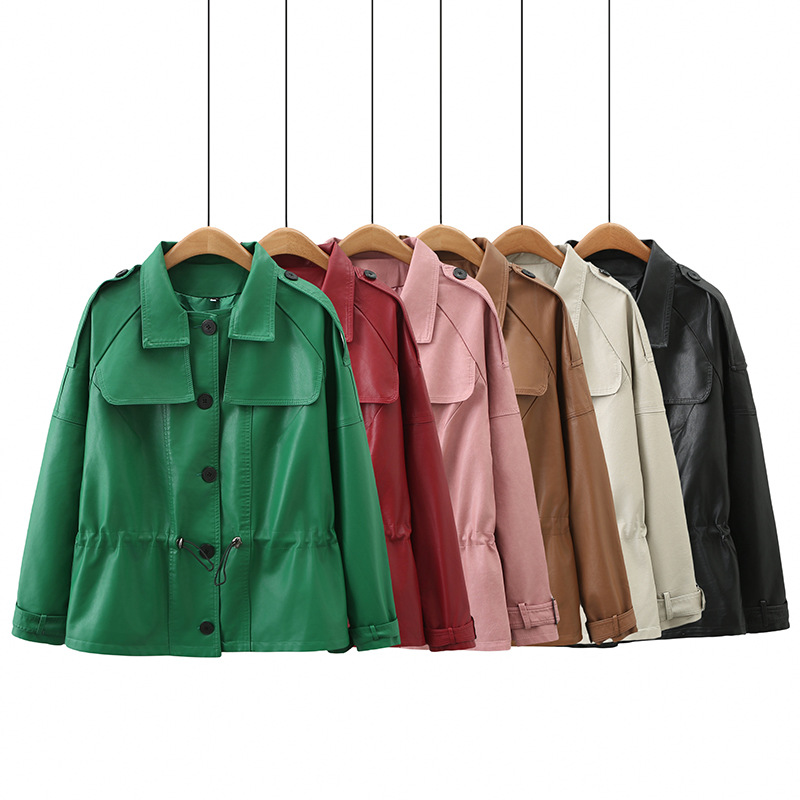 大きいサイズの婦人服の秋の新型ファッションの大きいポケットのカジュアルな皮の服の裾のひものカジュアルなコート37033