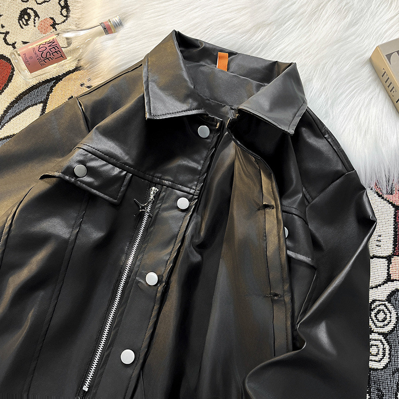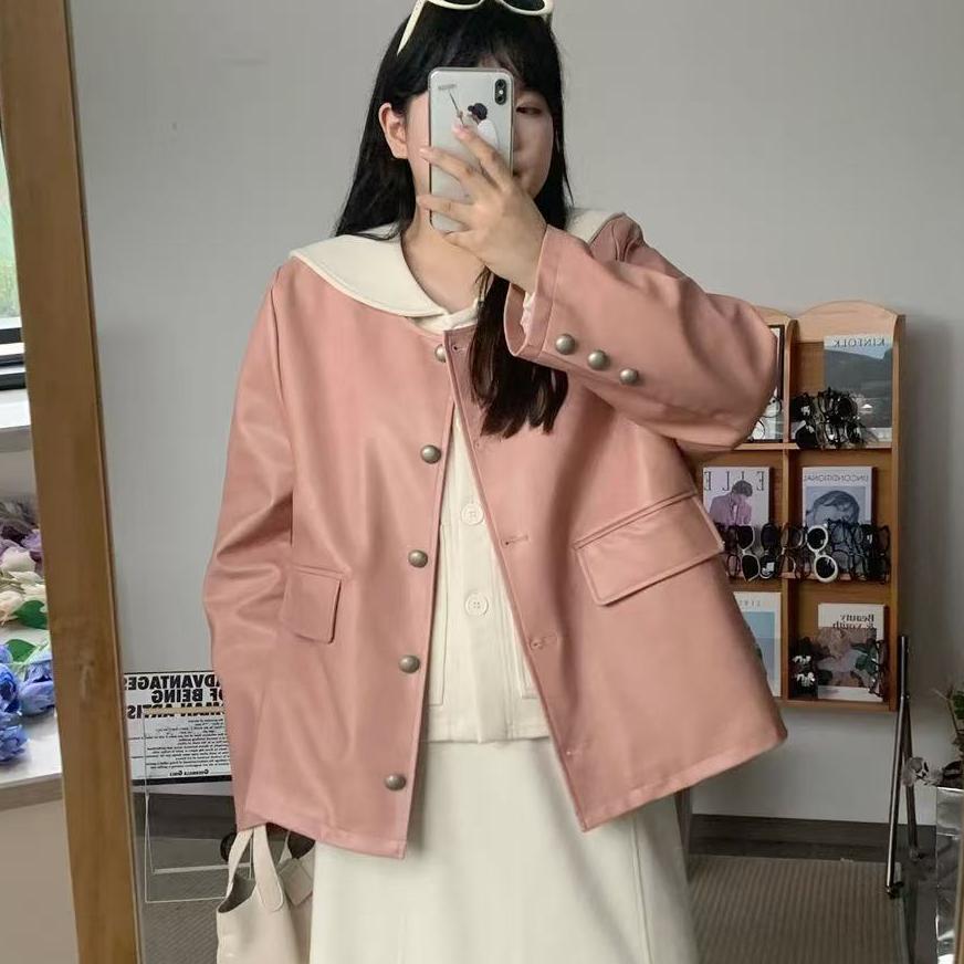A522 輝晨微太体型向け韓国風通勤スタイルゆったりPUジャケット 春物カジュアルルーズ長袖トップス