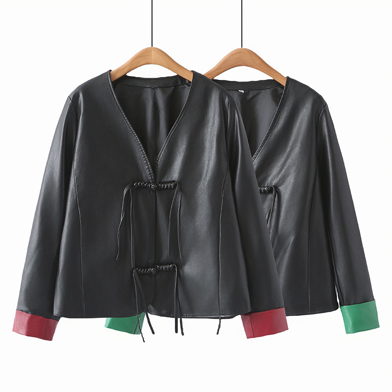 革のコートの女性のショートタイプの2024秋の新型の香港風の黒いpuの小さいアメリカの復古の機関車の服のジャケット