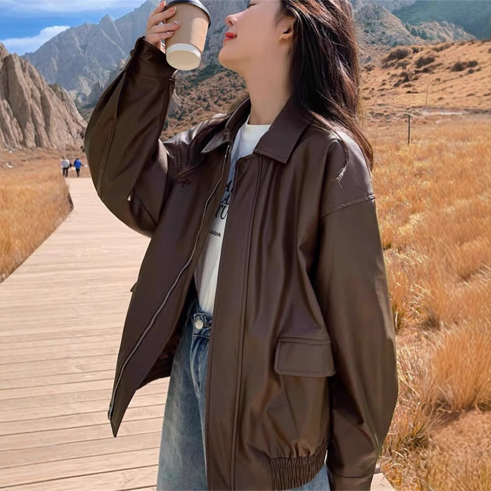 レトロな茶色の皮の服の女性の短い金の2024は秋の小さい子の韓国版のゆるい皮のジャケットのかっこいい機関車のコートに入ります。