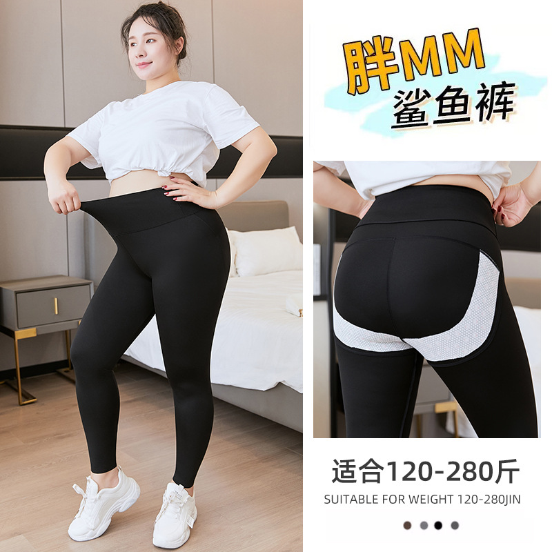 大きいサイズのシャークパンツ女性用 100kg 肥満女性向けヨガパンツ 春の新作 ハイウエストポケット付きメッシュヨガパンツ