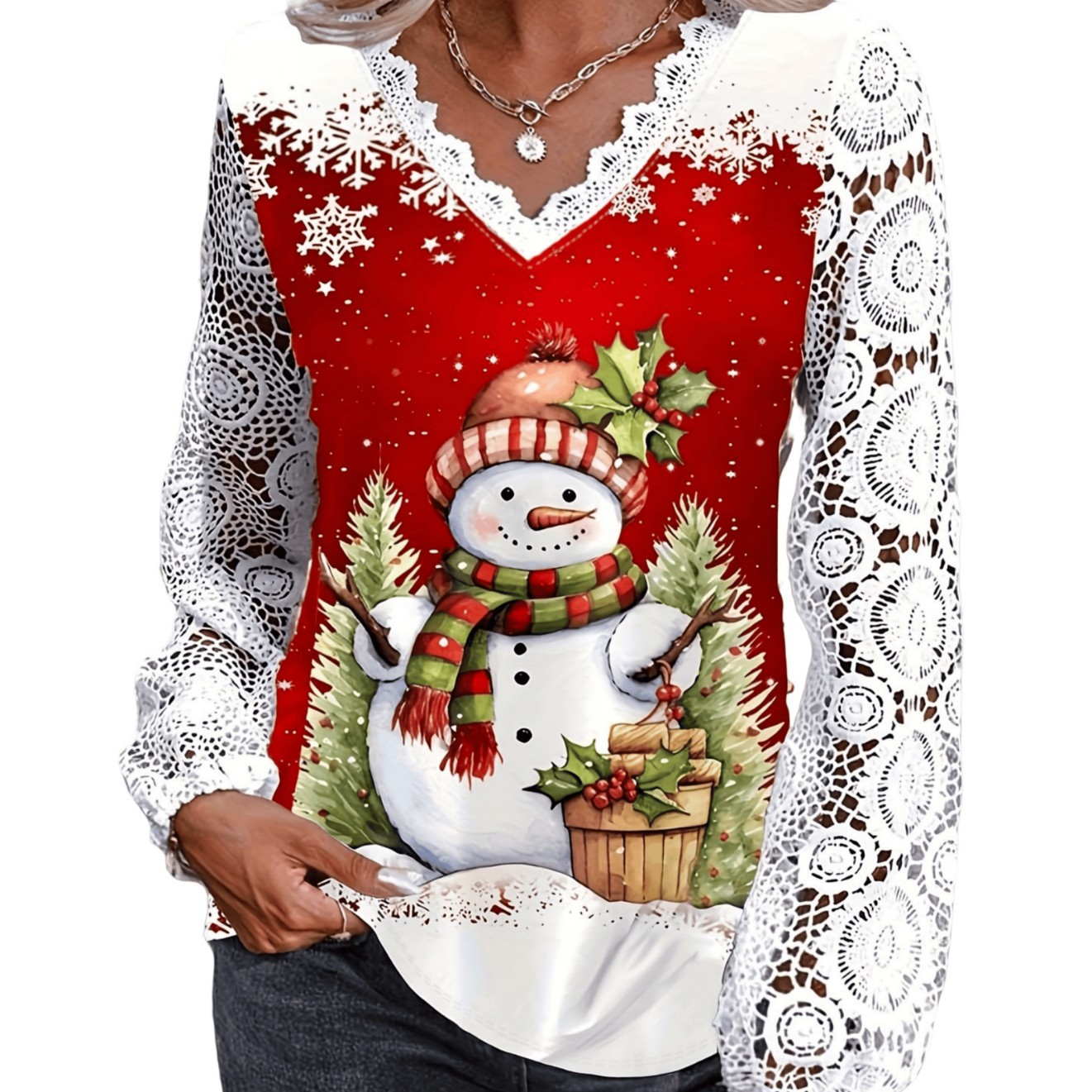 大きいサイズの女性レースの提灯の袖のクリスマスのtシャツレースはvネックのクリスマスの祝日のプリントのtシャツをつなぎます。