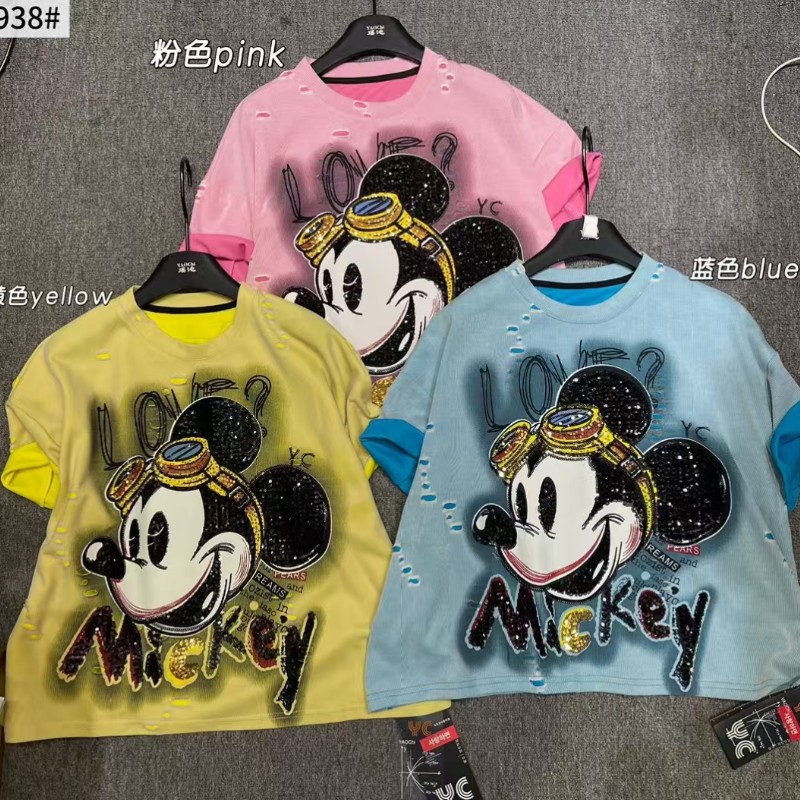 欧品1-200斤の大きいサイズの太ったmm重工の明るい漫画のビーズの刺繍の半袖のtシャツのゆったりしている百合の女性の上着