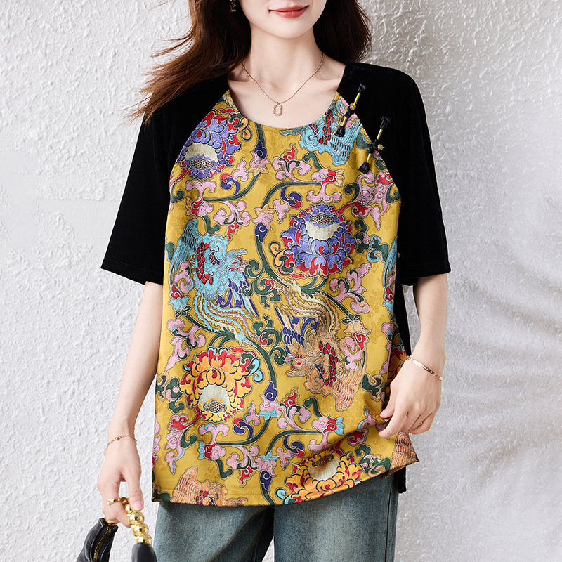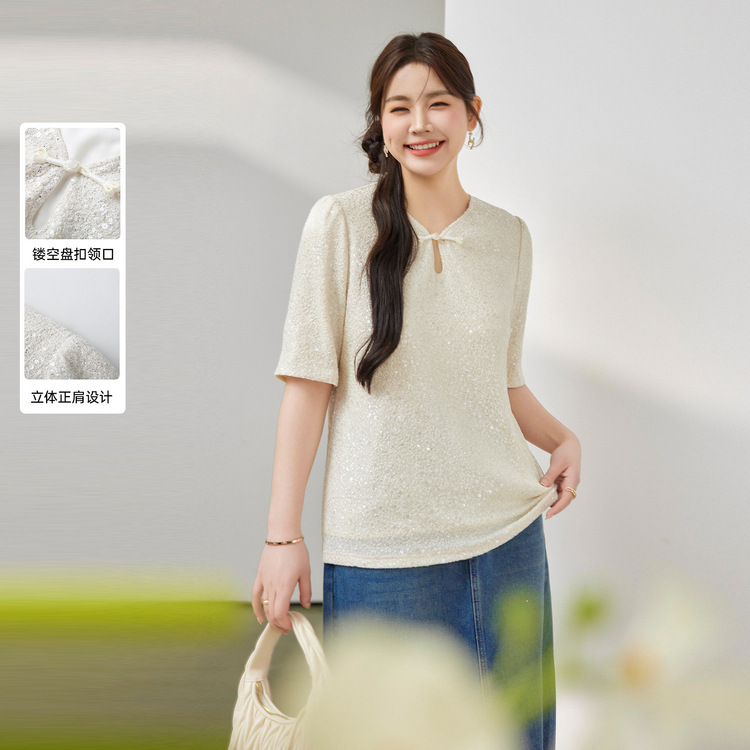 新しい中国風のTシャツ、スリムで大きいサイズの婦人服、高級スパンコール中空ボタントップ、ファットmm夏の新しいスタイル