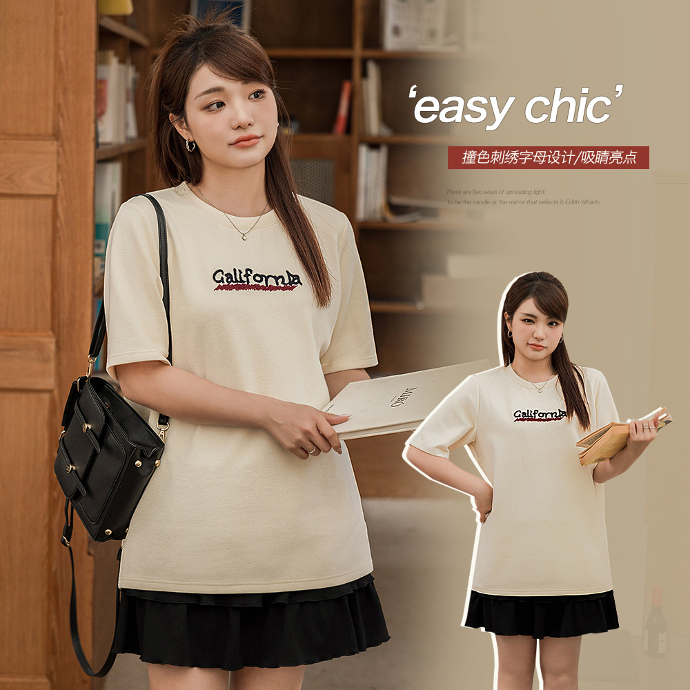 韓国版の肩の色の刺繍のアルファベットの半袖の太っているmmの大きいサイズの純綿の百合のゆったりしている見えるやせているtシャツ65221