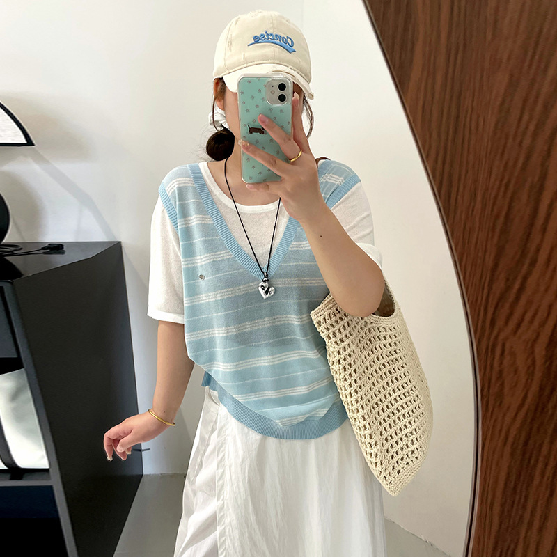 大きいサイズの婦人服の偽の2つの上着の女性のストライプのニットの服の2025夏の太ったmmはやせているゆったりしている半袖のtシャツの22936