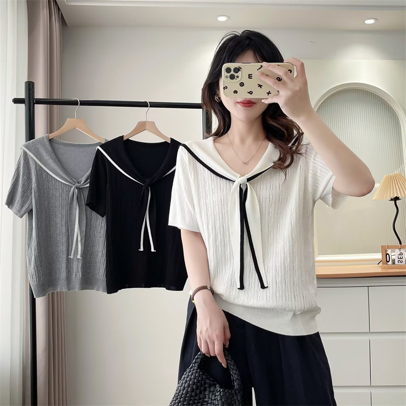 2025 夏プラスサイズの女性のニットウェア半袖ネイビーネクタイ Tシャツファット M アイスシルクシャツ弾性痩身トップ 1402