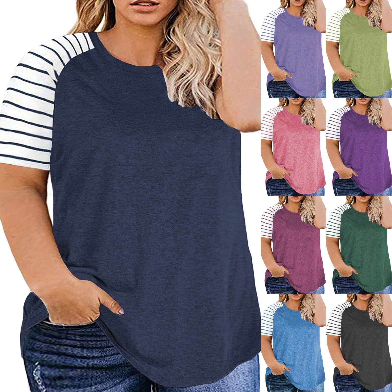 国境を越えたアマゾン欧米2023夏の新型女装肥婆大サイズゆるい半袖上着丸襟tシャツ