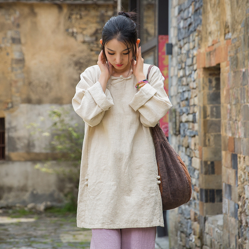 2025年秋新作綿麻婦人服、改良型大サイズ茶服、個性的な芸術風女性用ロングTシャツ(麻生地の染め加工)