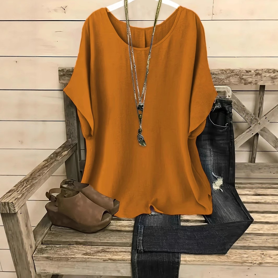 ヨーロッパとアメリカのクロスボーダープラスサイズの女性の夏のレトロなラウンドネック無地コットンとリネンのルーズカジュアル半袖トップTシャツ