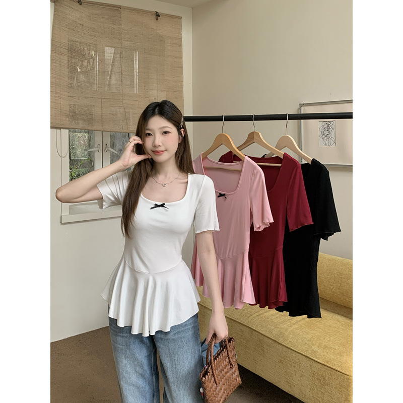 2025夏服の新型の大きいサイズのフランスの方襟の立体の蝶結びの魚の尾はやせている半袖のtシャツを現します。