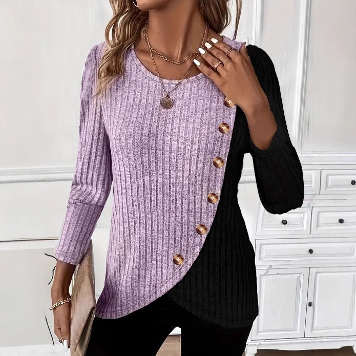 2025年夏ヨーロッパとアメリカの海外貿易新しいスタイルのラウンドネックボタン装飾2色ステッチ大きいサイズTシャツ