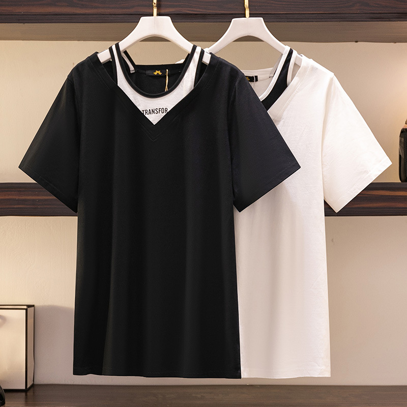 200斤太ったmmv襟半袖上着の中の長さのゆるい側開フォークの大きいサイズの女装太った女の子tシャツ2387