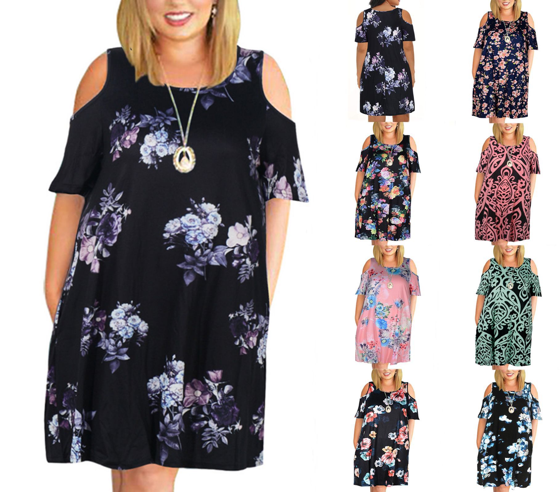 クロスボーダー2023アマゾン夏欧米女装プリント大サイズワンピースゆるい丸首露肩a字スカート