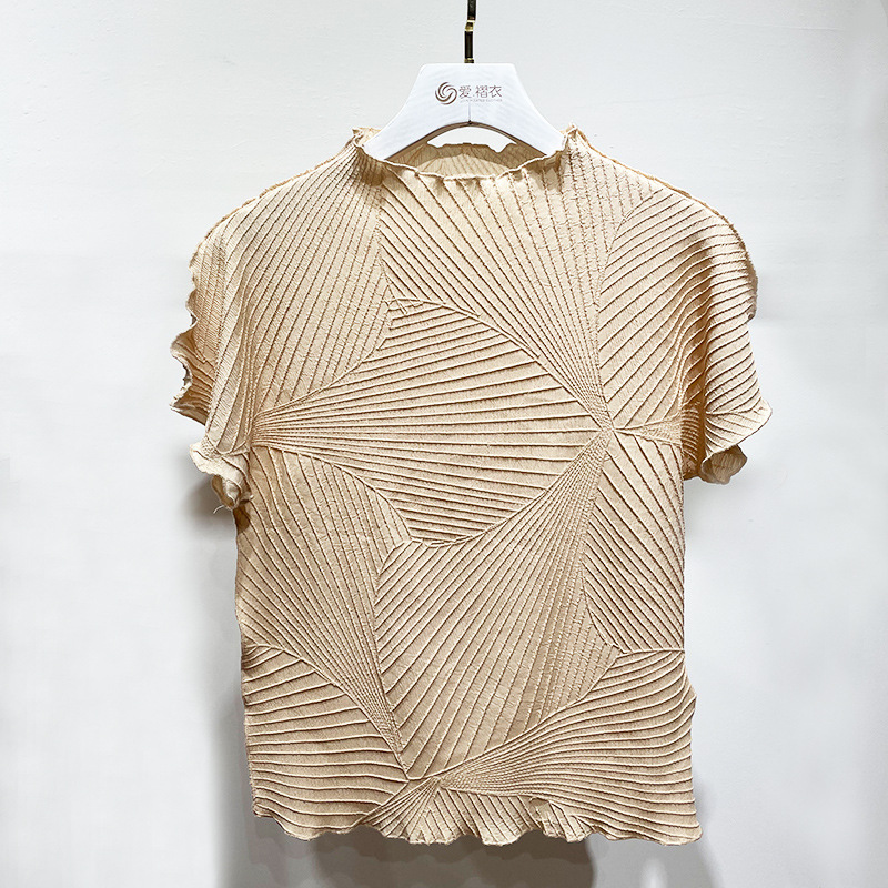 三宅のしわの半袖のtシャツの女性の不規則な重工業のエンボスのtシャツの百合のカジュアルな減齢の気質の韓国版の女性の上着