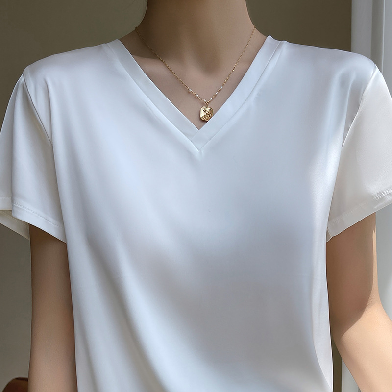 シルクのサテンのvネックtシャツの女性の夏の绢糸の修身はやせています。