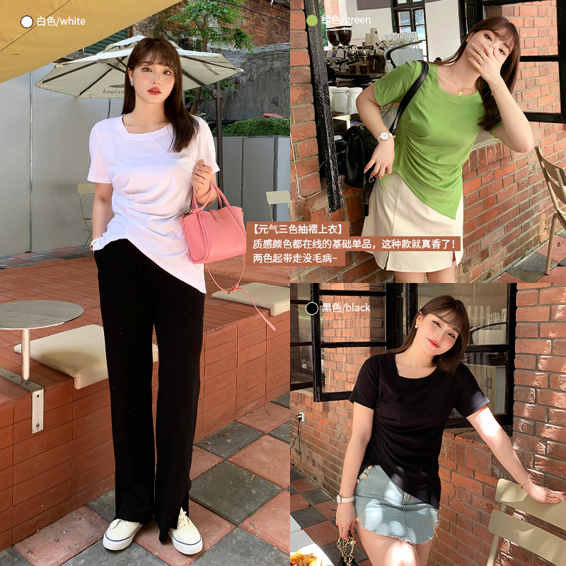 W820夏の新商品に太った大きいサイズの韓国版の気質のしわのtシャツの太ったmmの不規則なカジュアルな風の半袖のシャツ
