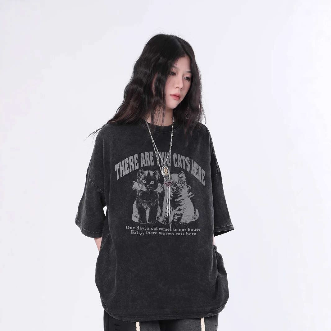 ヨーロッパとアメリカのオーバーサイズレトロウォッシュブラック半袖Tシャツレディース夏ニッチデザイン純綿猫半袖トップ
