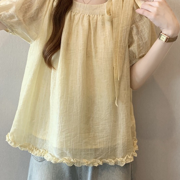 大きいサイズのリボンレースシフォン半袖シャツレディース夏ファットmmエッジヘムベビードールシャツトップ