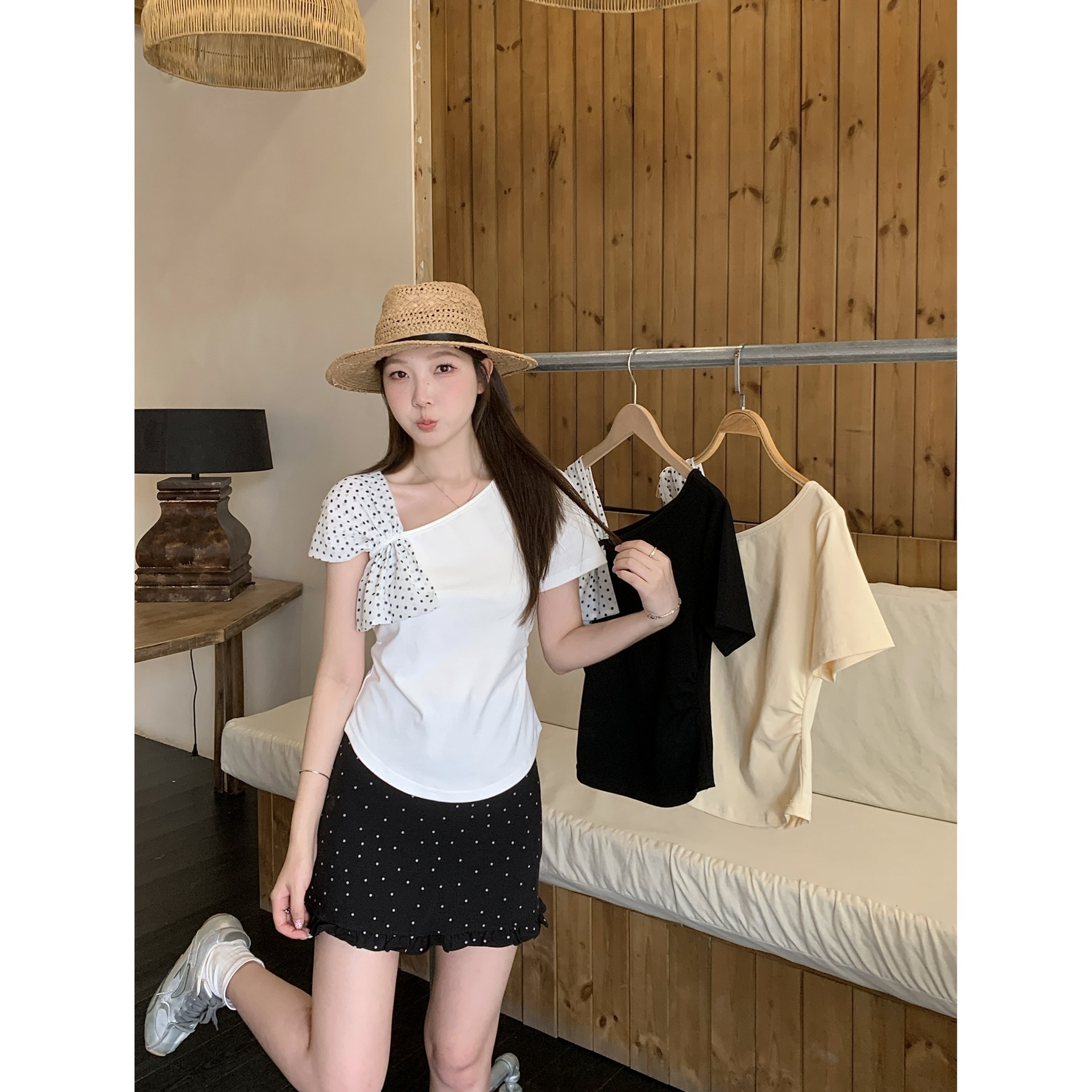 2025年夏のリアルショット ファットmm プラスサイズ スイート スパイシー リボン オフショルダー Tシャツ デザイン オフショルダー スリム トップ 80018