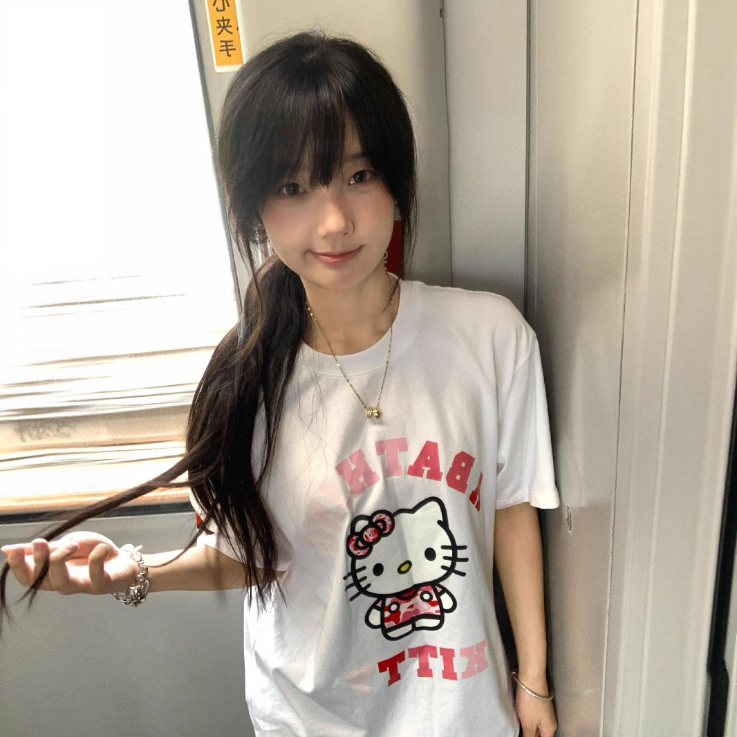 200 グラム純綿 KT プリント大きいサイズ半袖 T シャツ女性のための 2025 夏ルーズカジュアル多用途トップトレンディ